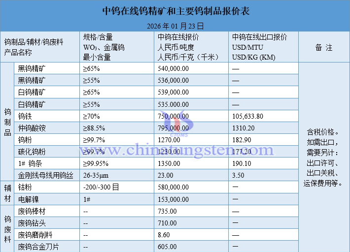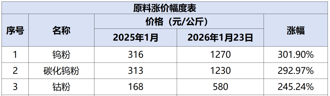 截止至2026年1月23日,钨粉已达1270元/公斤、碳化钨粉1230元/公斤、钴粉580元/公斤,同比2025年1月涨幅达240~300%: