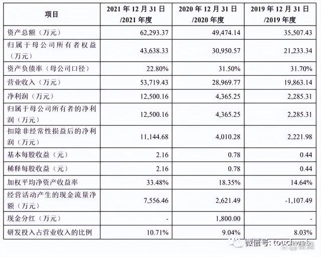 灿瑞科技2019年、2020年、2021年营收分别为1.99亿元、2.9亿元、5.37亿元;净利分别为2285.3万元、4365.25万元、1.25亿元;扣非后净利为2222万元、4010万元、1.11亿元。