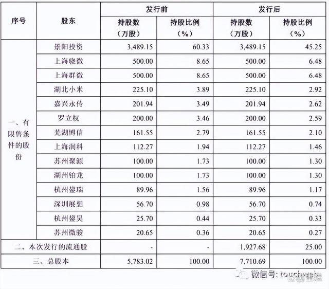IPO后,景阳投资持股为45.25%,上海骁微、上海群微分别持股为6.48%,湖北小米持股为2.92%,嘉兴永传持股为2.62%;