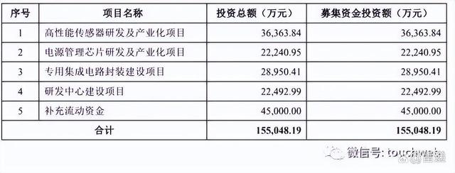 其中,3.63亿元用于高性能传感器研发及产业化项目,2.22亿元用于电源管理芯片研发及产业化项目,2.9亿元用于专用集成电路封装建设项目,2.25亿元用于研发中心建设项目,4.5亿元用于补充流动资金。