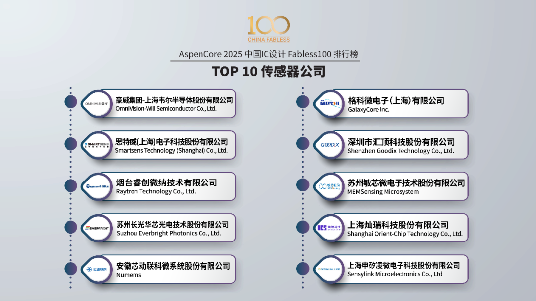灿瑞科技凭借在传感器领域的卓越创新能力和市场影响力,成功入选全球电子技术领域知名媒体集团AspenCore发布的半导体行业榜单“China Fabless 100 Top10传感器公司”,彰显了灿瑞科技在高端传感器设计与研发领域的领先地位。