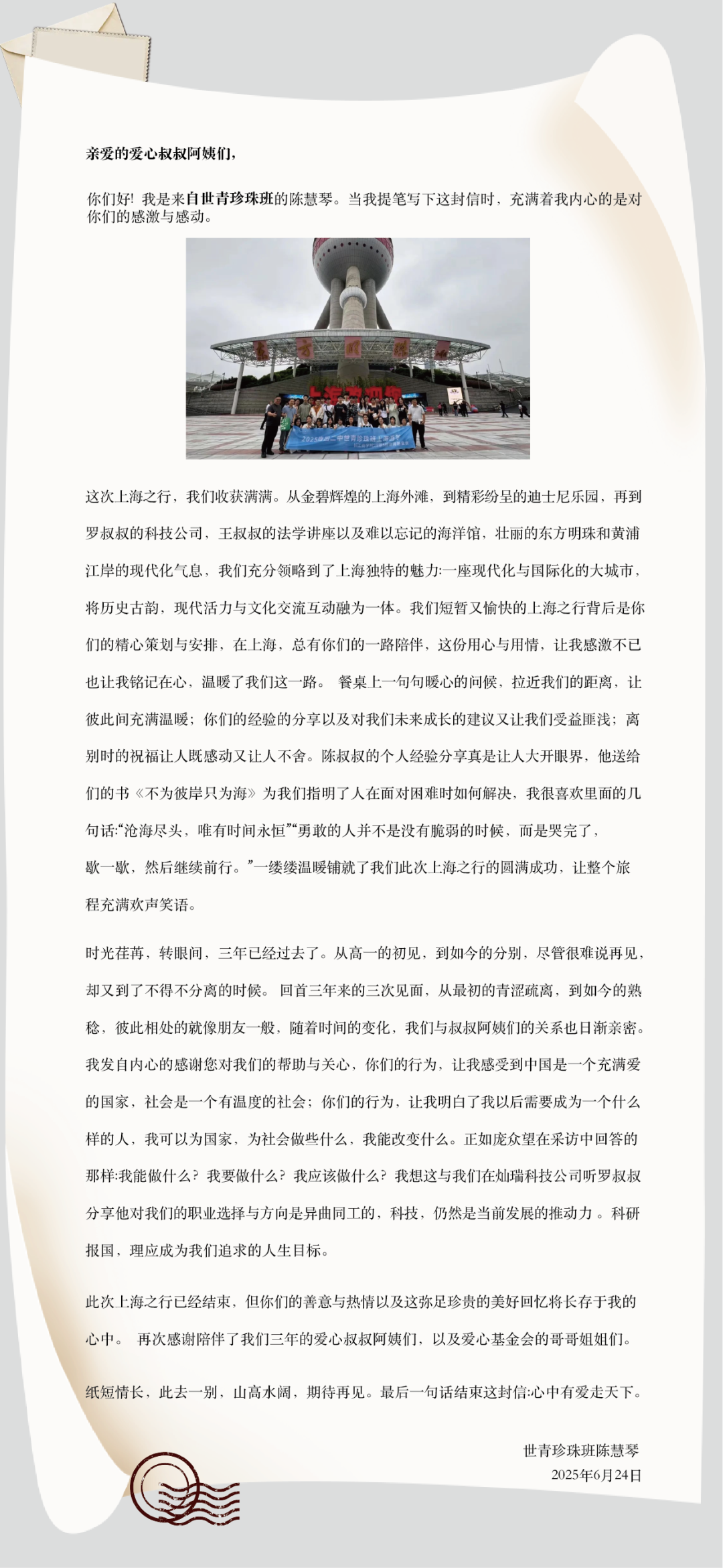 随后,同学们走进实验室,了解芯片研发、设计和生产流程,进一步激发了大家对芯片科技探索的兴趣。本次游学后灿瑞科技收到珍珠班学子的信件,相信爱会在彼此心中永远留下美好回忆。