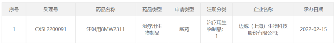2022年2月15日,药审中心承办了迈威(上海)生物科技股份有限公司1类生物制品注射用8MW2311的临床申请。