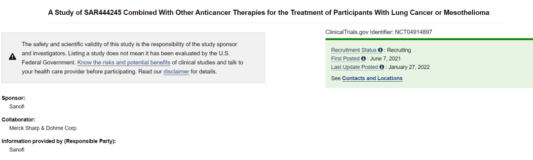 赛诺菲通过收购Synthorx也获得了一个PEG-IL2分子:THOR-707(也称作SAR444245)。SAR444245采用了与Nektar的NKTR-214不同的技术,研究人员利用工程细菌在分子结构中引入了非天然氨基酸,并在该位点结合不可裂解的PEG基团,从而获得与α链低亲和力的IL-2候选分子。该分子在高剂量使用时的安全性表现还要优于NKTR-214。SAR444245+默沙东PD-1单抗Keytruda联合用药的II期临床试验正在进行中。