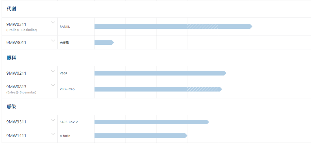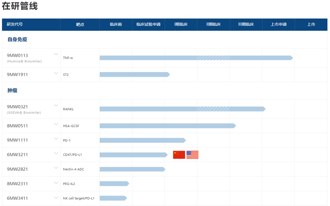 迈威生物是一家全产业链布局的创新型生物制药公司,专注于自身免疫、肿瘤、代谢、眼科、感染等治疗领域,凭借国际领先的五项特色技术平台和研发创新能力,建立了丰富且具有竞争力的管线。现有 15 个在研品种(包括 11 个创新品种和 4 个生物类似药)处于不同研发阶段,其中 3 个品种已提交上市申请,3 个品种处于关键注册临床研究阶段, 1 个品种处于 II 期临床试验阶段,4 个品种处于I期临床试验阶段,1 个品种已经取得临床默示许可,3 个品种处于临床前研究阶段。