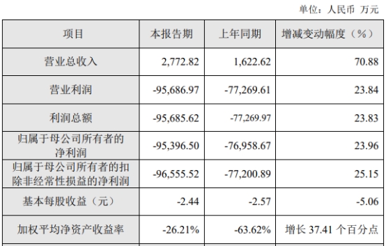 迈威生物2022年度业绩快报公告显示,2022年,公司实现营业总收入2,772.82万元,同比增长70.88%;归属于母公司所有者的净利润为-95,396.50万元,亏损同比增加23.96%;归属于母公司所有者的扣除非经常性损益的净利润-96,555.52万元,亏损同比增加25.15%。