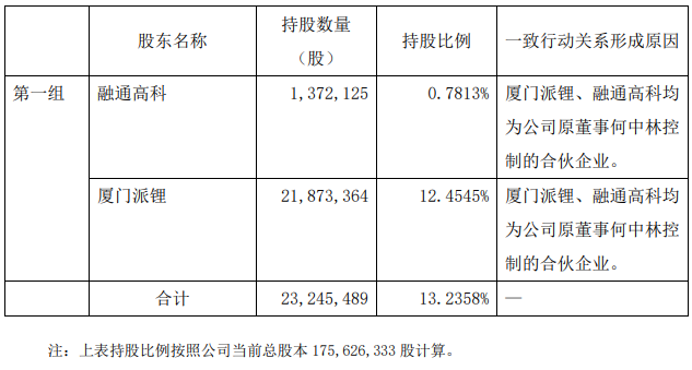 截至公告披露日,融通高科直接持有派能科技股份1,372,125股,占公司总股本的0.7813%。上述股份为公司首次公开发行前持有的股份,且于2021年12月30日起上市流通。融通高科与派锂(厦门)科技合伙企业(有限合伙)(曾用名:黄石融科创新投资基金中心(有限合伙),以下简称“厦门派锂”)系一致行动人,厦门派锂直接持有公司股份21,873,364股,占公司总股本的12.4545%,为公司首次公开发行前持有的股份,尚未解除限售。融通高科与厦门派锂合计直接持有公司股份23,245,489股,占公司总股本的13.2358%。