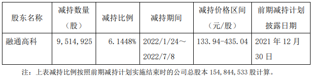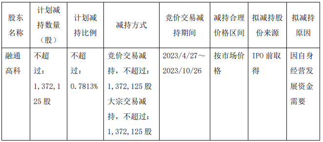 派能科技(688063.SH)昨晚公告称,公司股东北京融通高科资本管理中心(有限合伙)(以下简称“融通高科”)因自身经营发展资金需要,计划根据市场情况拟通过集中竞价方式及大宗交易方式减持公司股份数量不超过1,372,125股,减持比例不超过公司股份总数的0.7813%。