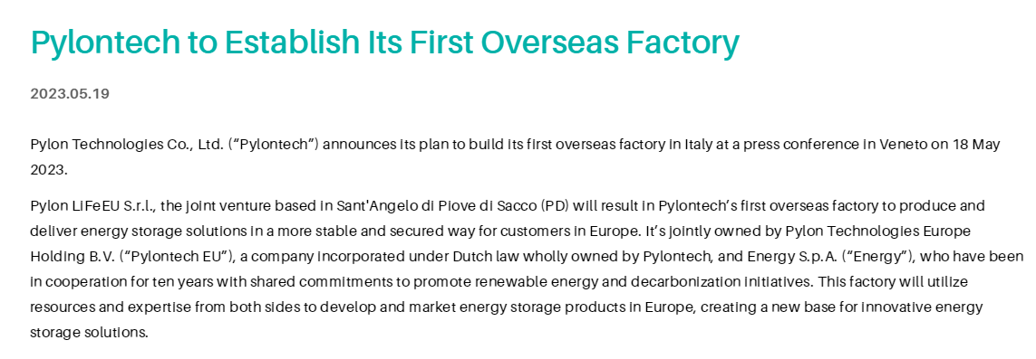 EnergyTrend储能获悉,当地时间5月18日,在威尼托举行的新闻发布会上,派能科技宣布了将在意大利建立第一家海外工厂的计划。