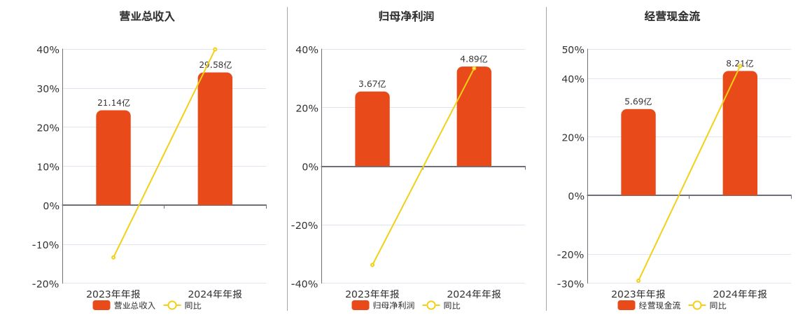 公司营业总收入为29.58亿元。归母净利润为4.89亿元。经营活动现金净流入为8.21亿元。