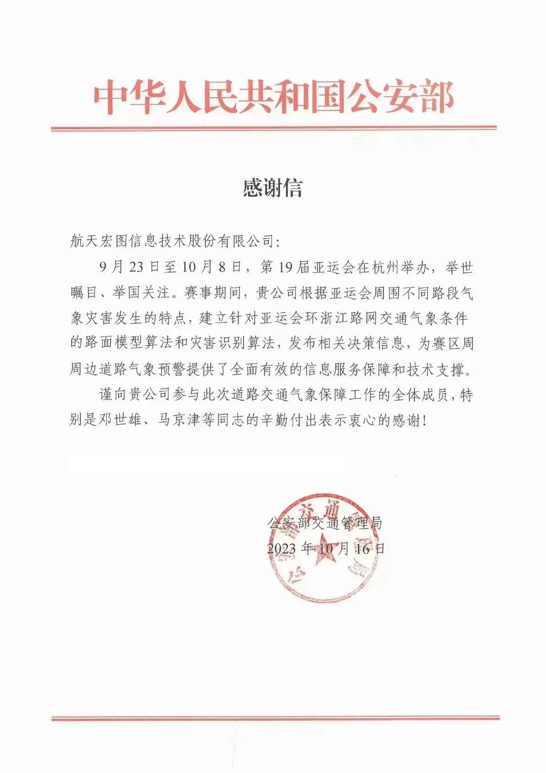 近日,航天宏图收到公安部颁发的感谢信,对航天宏图在第19届亚运会交通气象预警提供了全面有效的信息服务保障和技术支撑,公司所表现出的专业素养、服务意识和责任担当予以高度认可与肯定!
