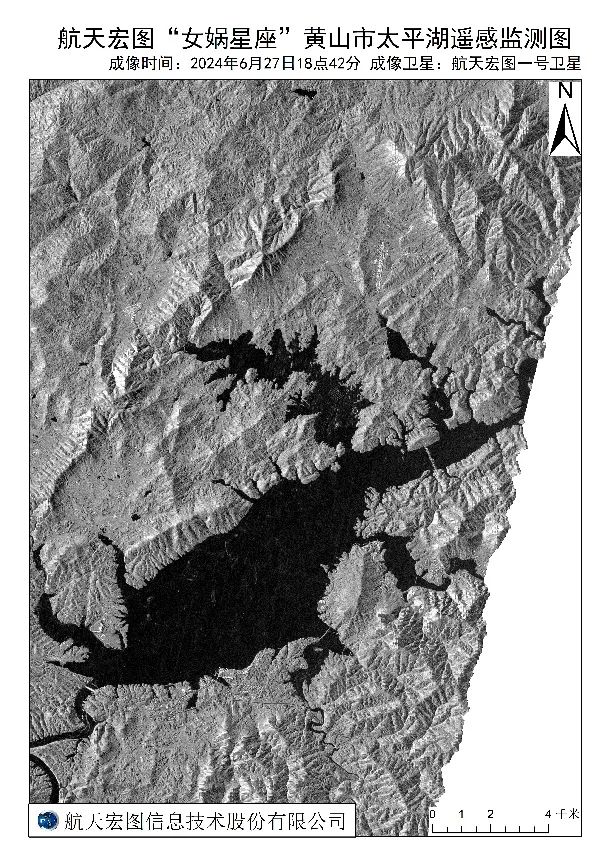 为洪涝监测提供技术支持的主要是SAR智能提取模型,该模型通过对道路的辅助识别减少了水体、道路的混淆,同时也提供了SAR影像下的道路解译能力。进一步,融合了DEM信息有效过滤了山体阴影,使得天权SAR水体提取在各种地理条件下都具有很强的泛化能力,可以应对各种汛期监测任务。如图“黄山市太平湖淹没范围图”的洪水淹没范围来源于天权SAR智能提取模型对宏图一号01组卫星实拍数据水体解译结果。