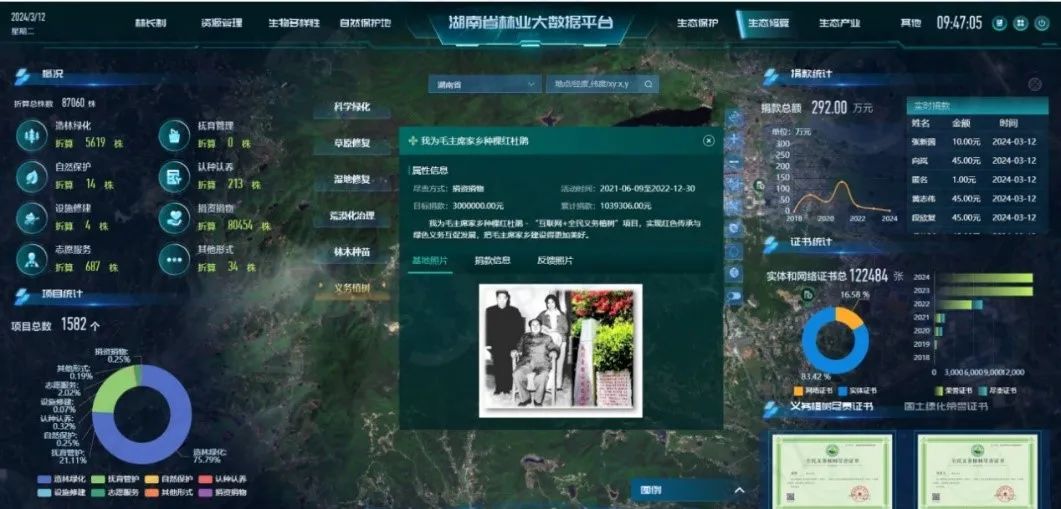 依照《全民义务植树尽责形式管理办法(试行)》中关于造林绿化、抚育管护、自然保护、认种认养、设施修建、捐资捐物、志愿服务和其他形式等8类创新尽责形式的相关规定,航天宏图助力湖南、浙江等省份对互联网义务植树系统进行优化完善。如今,公众只需通过义务植树网或在手机微信搜索“全民义务植树”公众号,点击“尽责参与”,即可轻松完成义务植树尽责活动,并且获得国家颁发的全民义务植树尽责证书或国土绿化荣誉证书。
