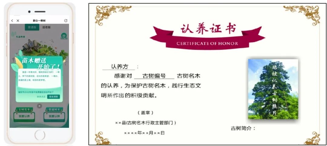 同时,为进一步提高公众环保意识,增强群众保护森林、爱护树木的积极性,打造了一款全民参与的认种认养小程序,实现线上认种、认养,线下植树、查看植树进度、办理植树证书等功能,全方位助力古树名木保护,让古老的树木在现代科技的守护下重焕生机。