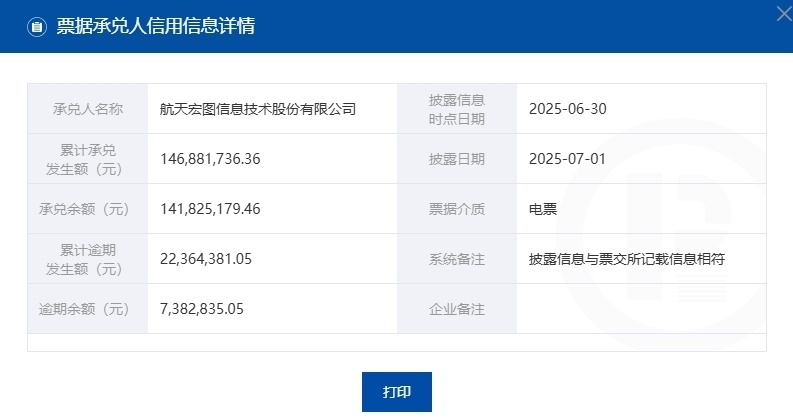 上海票据交易所数据显示,截至6月30日,航天宏图逾期余额为738.28万元,累计逾期发生额达2236.44万元。依据《商业汇票信息披露操作细则》,该票交所已暂停其商业汇票承兑服务权限,企业须清偿全部逾期票据并完成信用修复流程后方可申请恢复。
