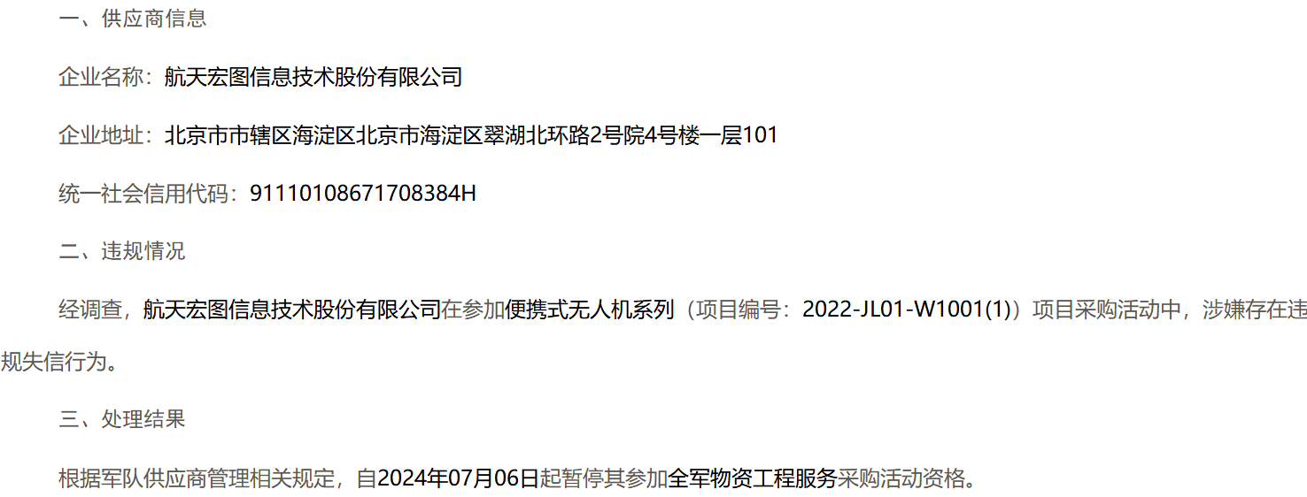 2024年7月6日,军队采购网于再次公告称,经查,航天宏图参加无人机系列项目采购活动中,涉嫌存在违规失信行为,根据相关规定,决定对航天宏图暂停参加全军物资工程服务采购活动资格。