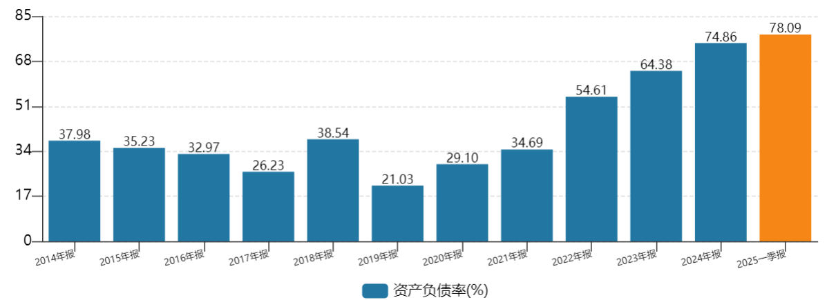 另一个引人关注的是,航天宏图的债务情况。截至2025年第一季度,航天宏图总负债达38.6亿元,较2024年底增加8.03%,资产负债率进一步增至78.09%,创近几年新高。