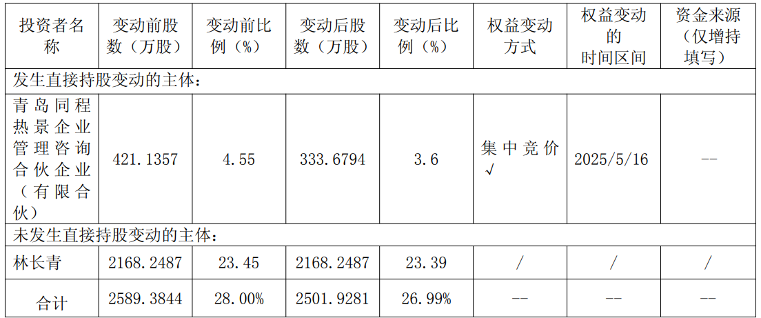 中国经济网北京5月20日讯热景生物(688068.SH)昨日晚间披露公告,公司的控股股东/实控人的一致行动人青岛同程热景企业管理咨询合伙企业(有限合伙)(简称“青岛同程”)于2025年5月16日通过集中竞价减持,股东权益合计比例从28.00%减少到26.99%,本次权益变动属于股东减持股份,不触及要约收购。