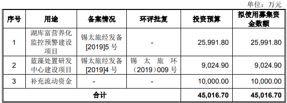 德林海上市前披露的招股书显示,公司拟募集资金4.50亿元,分别用于“湖库富营养化监控预警建设项目”、“蓝藻处置研发中心建设项目”、“补充流动资金”。
