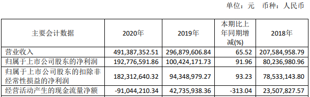 上市首年,德林海业绩向上,但经营活动产生的现金流量净额转负。2020年,德林海营业收入为4.91亿元,同比增长65.52%;归属于上市公司股东的净利润为1.93亿元,同比增长91.96%;归属于上市公司股东的扣除非经常性损益的净利润为1.82亿元,同比增长93.23%;经营活动产生的现金流量净额为-9104.42万元,同比减少313.04%,2019年同期为4273.60万元。