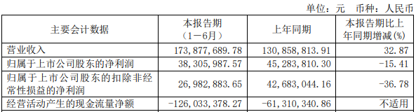 今年上半年,德林海营业收入为1.74亿元,同比增长32.87%;归属于上市公司股东的净利润为3830.60万元,同比下滑15.41%;归属于上市公司股东的扣除非经常性损益的净利润为2698.29万元,同比下滑36.78%;经营活动产生的现金流量净额为-1.26亿元,上年同期为-6131.03万元。