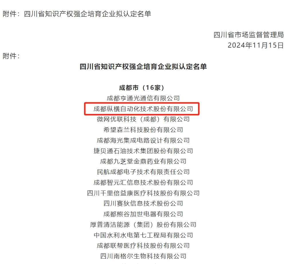 在新时代知识产权强国战略的引领下,纵横股份在知识产权保护与技术创新的道路上再次迈出了坚实的一步,成功获批四川省知识产权强企培育企业。