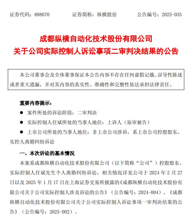 7月18日,成都纵横自动化技术股份有限公司(简称“纵横股份”,688070.SH)公告披露,控股股东、实际控制人任斌收到四川省成都市中级人民法院《民事判决书》。四川省成都市中级人民法院就任斌因与邝明芳离婚纠纷不服四川天府新区人民法院一审判决提起上诉事宜作出终审判决。