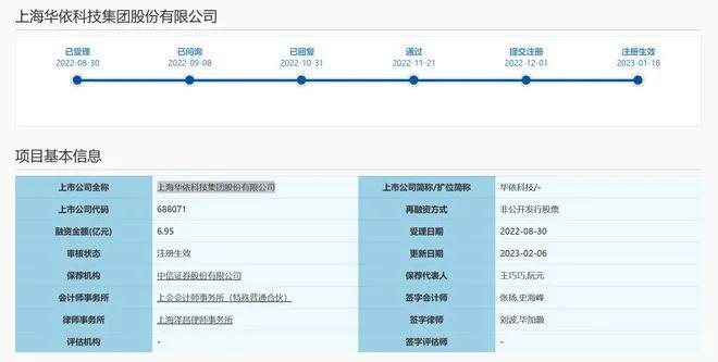 1 月 18 日,上海华依科技集团股份有限公司(以下简称"华依科技")"2022 年度向特定对象发行股票"募资项目在上海证券交易所注册生效。