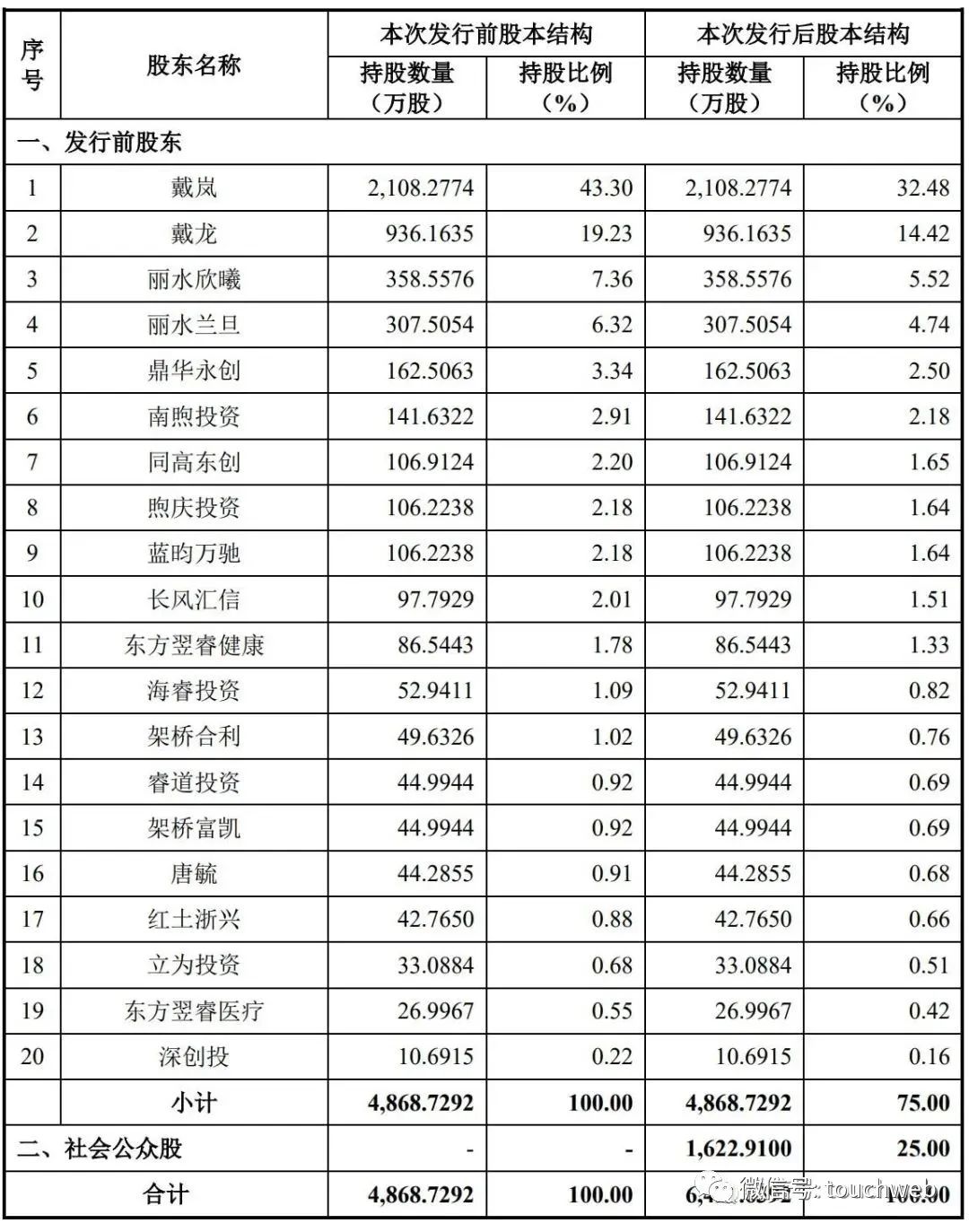 IPO后,戴岚直接持股为32.48%,戴龙持股为14.42%,丽水欣曦持股为5.52%,丽水兰旦持股为4.74%,鼎华永创持股为2.5%;
