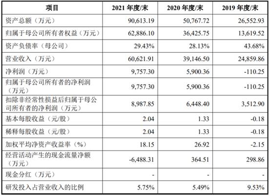 2019年至2021年,毕得医药的营业收入分别为24,859.86万元、39,146.50万元和60,621.91万元;净利润/归属于母公司所有者的净利润分别为-110.25万元、5,900.36万元和9,757.30万元;扣除非经常性损益后归属于母公司所有者的净利润分别为3,512.90万元、6,448.40万元和8,987.85万元;经营活动产生的现金流量净额分别为298.86万元、364.51万元和-6,488.31万元。
