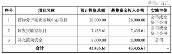 公司本次发行募集资金总额142,816.08万元;扣除发行费用后,募集资金净额为130,899.89万元。该公司最终募集资金净额较原计划多87,464.28万元,根据公司2022年9月29日披露的招股说明书显示,公司拟募集资金43,435.61万元,用于药物分子砌块区域中心项目、研发实验室项目、补充流动资金。