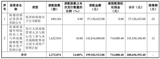 毕得医药本次发行的战略配售由保荐机构相关子公司跟投、发行人高级管理人员与核心员工专项资产管理计划组成。本次发行的保荐机构(主承销商)按照《实施办法》和《承销指引》的相关规定参与本次发行的战略配售,跟投主体为海通创新证券投资有限公司,跟投配售数量为本次公开发行数量的4.00%,即649,164股,获配金额57,126,432.00元。发行人的高级管理人员与核心员工参与本次战略配售设立的专项资产管理计划——富诚海富通毕得医药员工参与科创板战略配售集合资产管理计划实际获配1,622,910股,获配金额142,816,080.00元,占本次发行数量的10.00%。