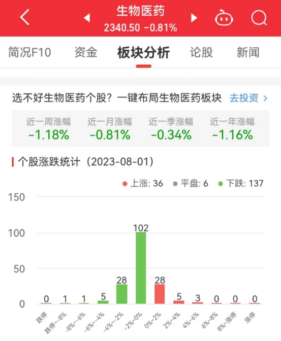 今日,生物医药板块整体跌幅0.81%,其中36只股票上涨,6只股票平盘,137只股票下跌。