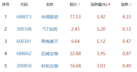 其中,毕得医药、*ST吉药、青海春天、迈威生物、科拓生物位列板块涨幅前五位,涨幅分别为5.92%、5.20%、5.12%、3.95%、3.03%。