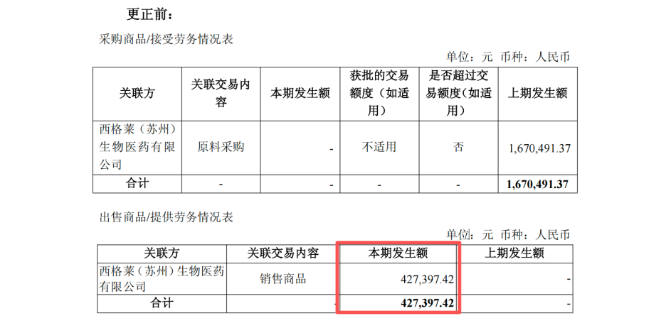 毕得医药向西格莱销售商品(更正后为216.92万元),同时向西格莱购买专利(上期377.36万元)。
