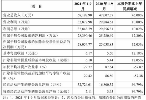 上市公告书显示,2021年1-9月,安旭生物营业收入为6.82亿元,同比增长45.08%;实现归属于母公司股东的净利润2.84亿元,同比增长12.30%;实现归属于母公司股东的扣除非经常性损益后的净利润2.81亿元,同比增长12.05%;经营活动产生的现金流量净额为3.27亿元,同比增长94.79%。