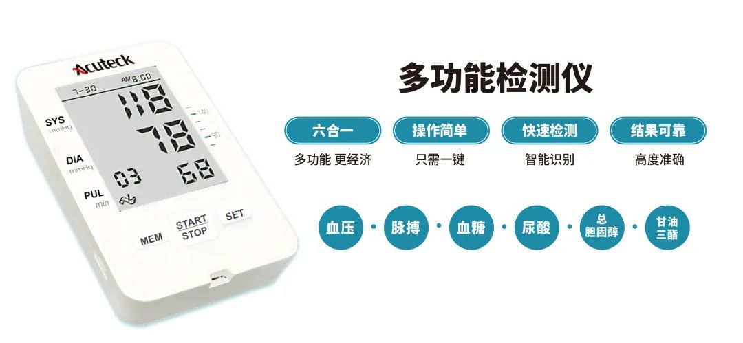 多功能仪适用于居家健康检测场景,可以对血压、脉搏和血糖、尿酸、总胆固醇、甘油三酯进行测量: