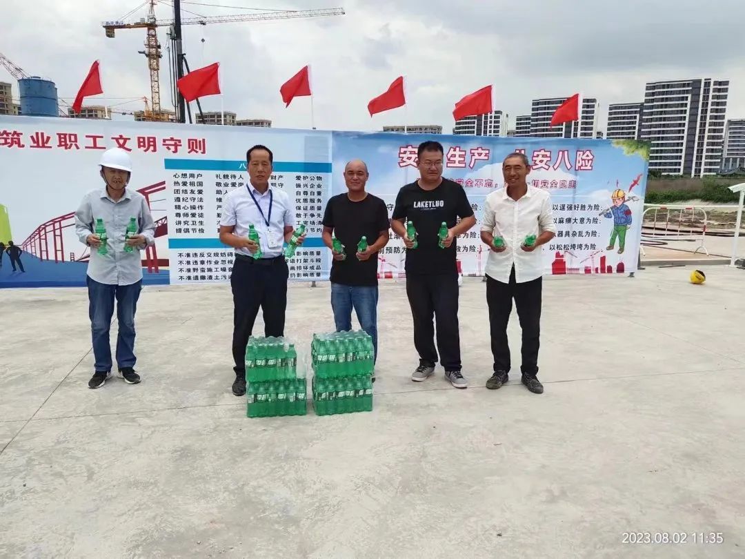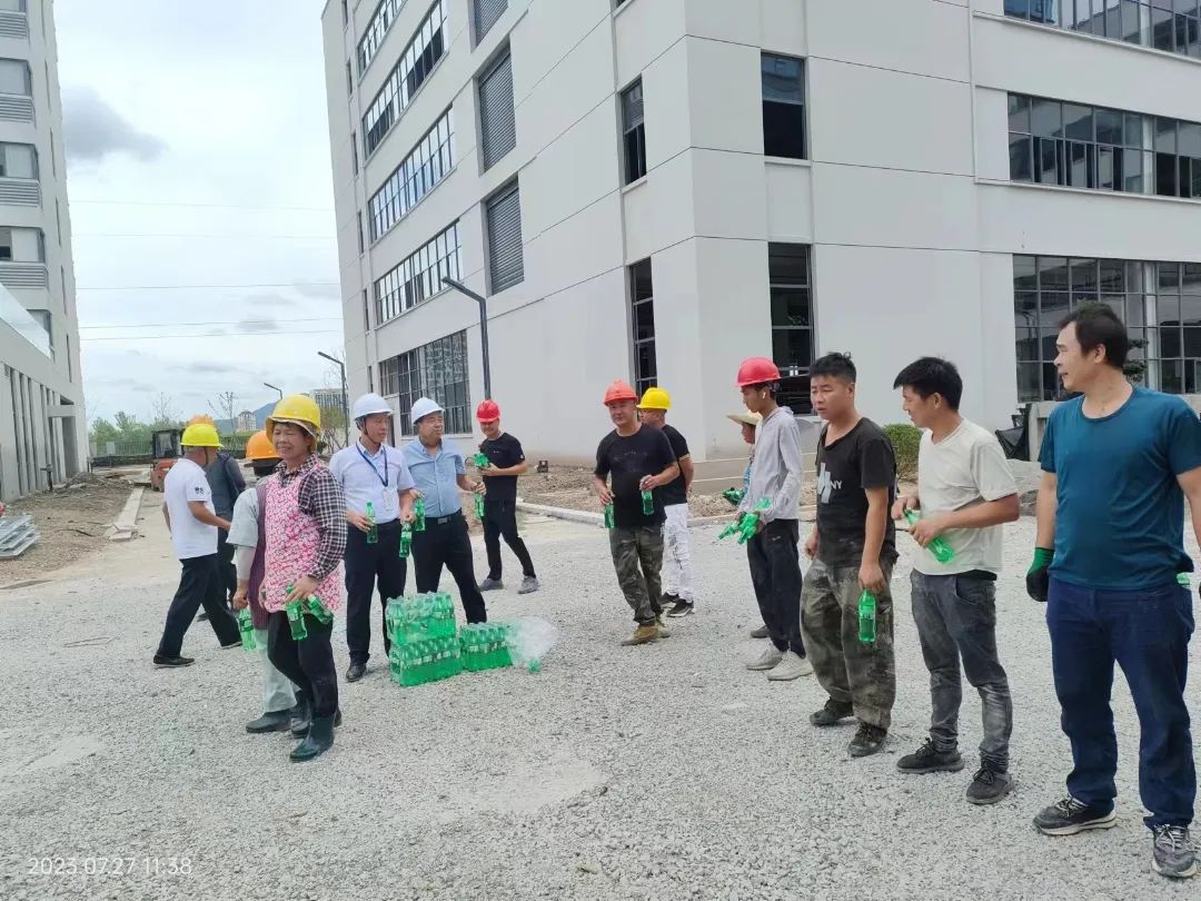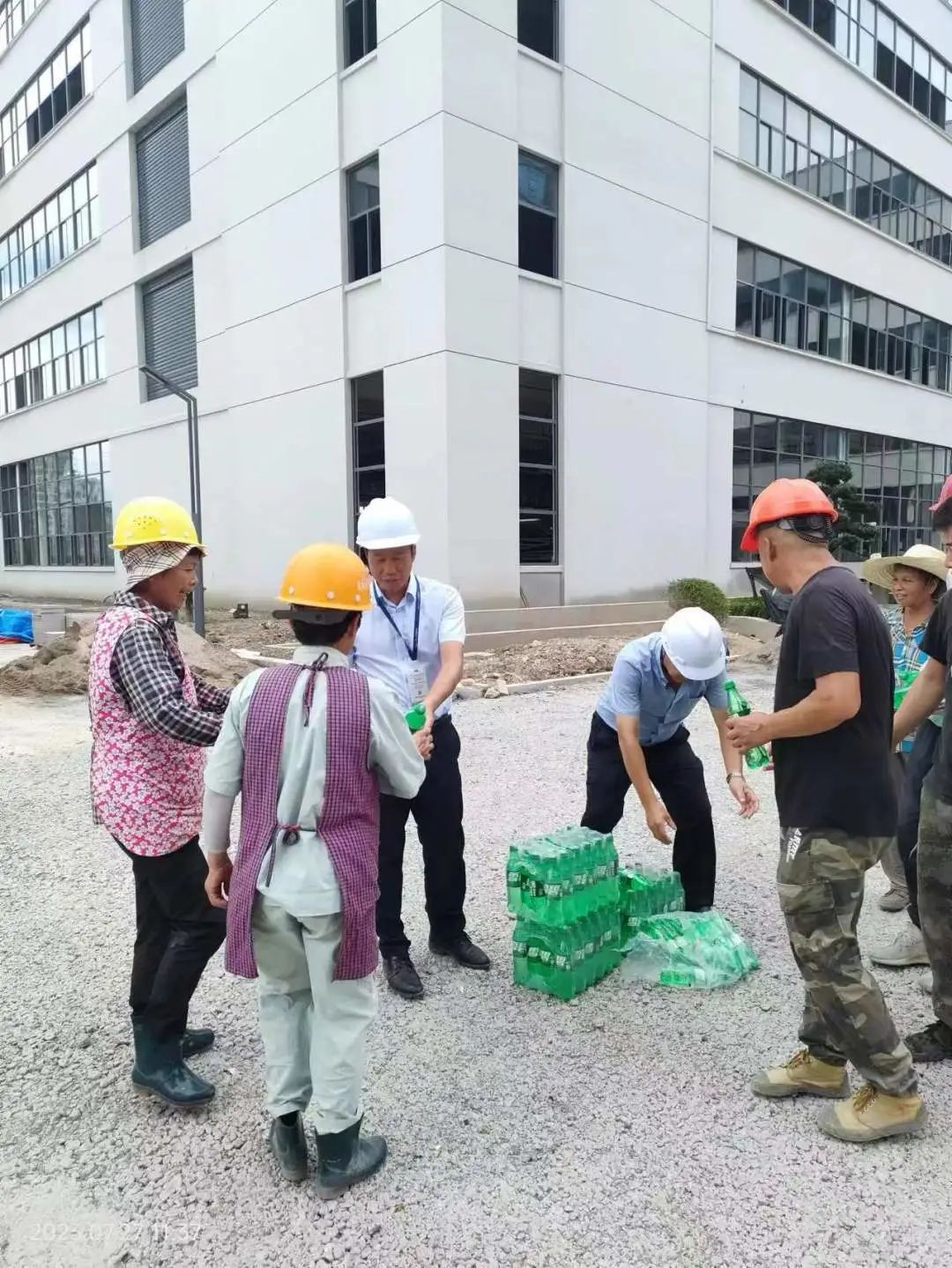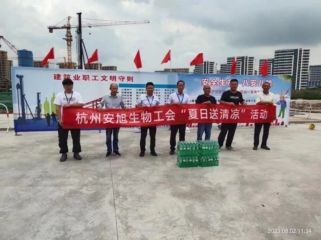 慰问组先后来到安旭生物子公司杭州博进医疗制品有限公司、浙江旭民生物技术有限公司、浙江艾旭生物工程有限公司和位于丰收湖畔的安旭生物总部建设工地等地,送上饮料,为他们送去夏日丝丝清凉。