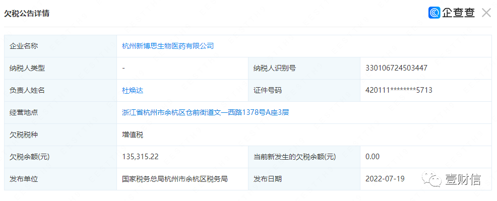 2018年11月诺泰生物收购了杭州新博思生物医药有限公司(下称:新博思)60%的股份,收购价格为1,500.00万元。2022年6月,诺泰生物将持有的控股子公司新博思45%股权转让给浙江众成医药有限公司,处置价格为1,350.00万元。本次股权转让完成后,公司持有新博思的股权比例为15%。需要注意的是新博思在诺泰生物控股期间存在欠税的情况。据企查查,2022年7月19日余杭区税务局发布了两条欠税公告,内容显示新博思分别欠缴增值税135,315.22元和城市维护建设税9,472.06元。