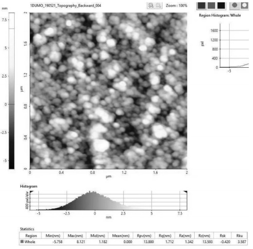 图2为盖板表面AFM图,上述盖板为玻璃基板上覆有二氧化硅低折射率层L以及五氧化二钽高折射率层H的摄像模组光学元件。低折射率层L层厚为100-200nm,折射率为1.46-1.50;高折射率层H层厚为80-120nm,折射率为2.05-2.2。