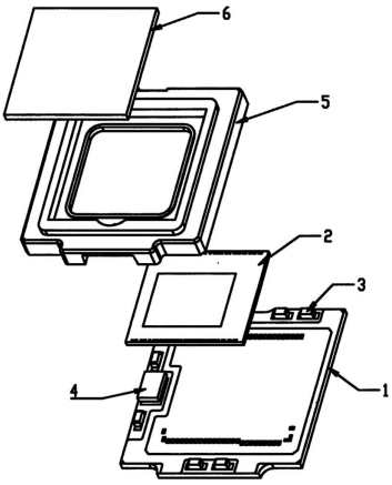 图1为本发明提出的CLCC封装体结构示意图,其中包括基板,其上贴装有位于中部的CMOS及位于边缘位置的电容电阻和驱动马达,基板上设有一隔离墙底座,其上对应基板上CMOS、电容电阻和驱动马达的位置分别设有CMOS传感器空位、电容电阻空位及驱动马达空位,CMOS传感器空位上表面安装一盖板。盖板通过CVD过程或者ALD过程实现功能膜与衬底的结合。