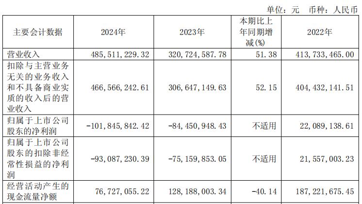 美迪凯(688079.SH)近日发布的2024年年度报告显示,2024年,公司实现营业收入4.86亿元,同比增长51.38%;归属于上市公司股东的净利润-1.02亿元,上年同期为-8445.09万元;归属于上市公司股东的扣除非经常性损益的净利润-9308.72万元,上年同期为-7515.99万元;经营活动产生的现金流量净额7672.71万元,同比减少40.14%。