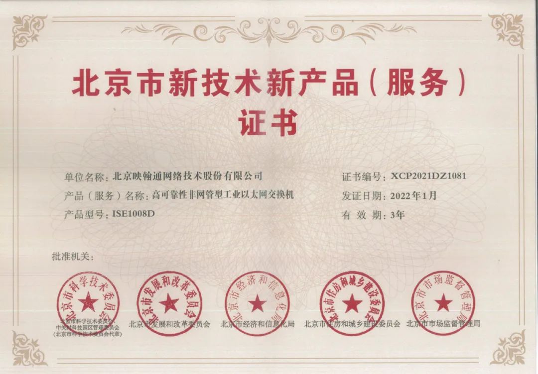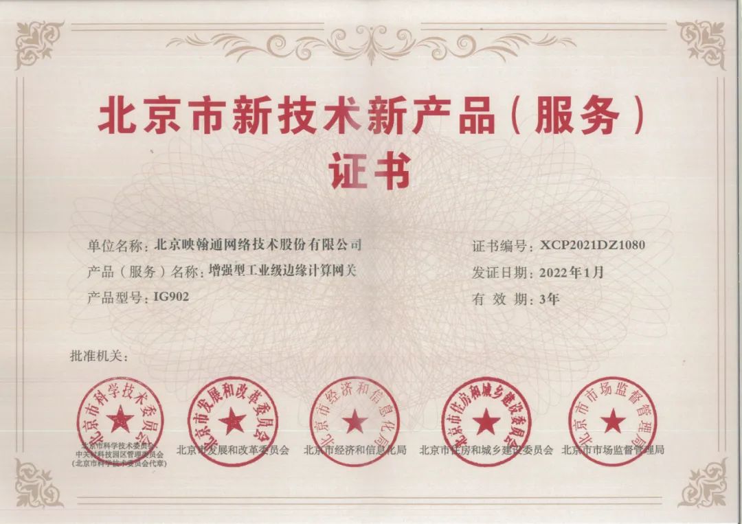 近日,根据《北京市新技术新产品(服务)认定管理办法》的评选规则,北京映翰通网络技术股份有限公司(以下简称“映翰通”)研发制造的?增强型工业级边缘计算网关IG902、高可靠性非网管型工业以太网交换机ISE1008D 荣获由北京市科委、市发展改革委、市经济和信息化局、市住房城乡建设委、市市场监管局、中关村管委会六部门联合颁发的“北京市新技术新产品(服务)证书”。