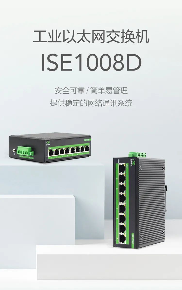 ISE1008D非网管型工业交换机为满足电力、交通、工业控制及其他严酷工业环境而设计,该产品集可靠的工业品质、简单易用的功能设计于一体,为用户在苛刻工业环境下搭建安全稳定的网络通讯系统。
