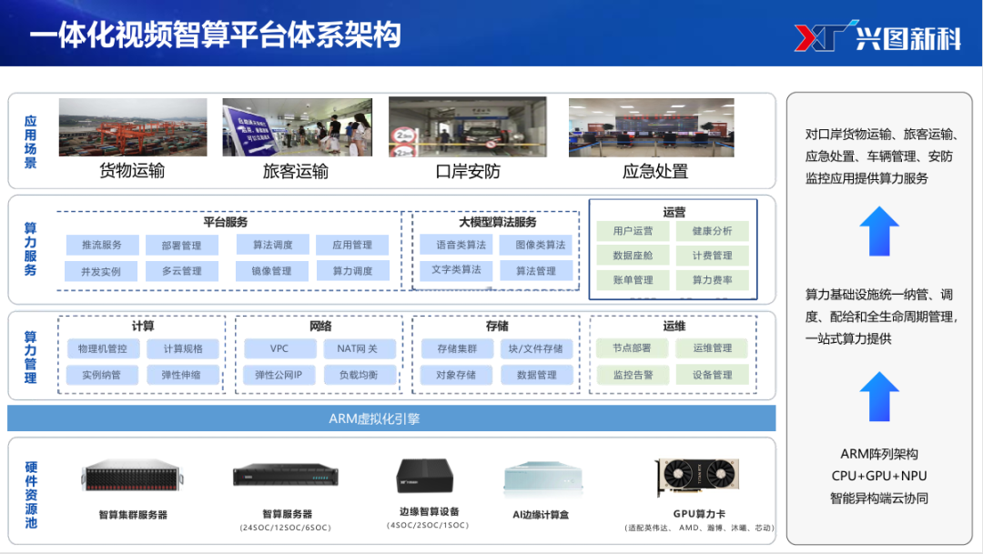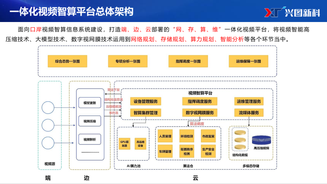 在演讲中,兴图新科还展示了一体化视频智算平台在智慧口岸场景中的可应用场景。从视频汇聚、无差别视频调度,到优化视频传输效果、轻量化视频存储,再到云边端协同计算、赋能智能化应用,兴图新科的技术和产品为口岸的货物运输、旅客运输、安防监控等应用提供了全方位的算力服务。