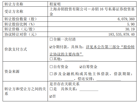 兴图新科(688081.SH)昨日发布关于控股股东、实际控制人协议转让部分公司股份暨权益变动的提示性公告。兴图新科控股股东、实际控制人程家明(以下简称“转让方”)与上海赤钥投资有限公司(代表“赤钥16号私募证券投资基金”,以下简称“赤钥基金”或“受让方”)于2026年3月28日共同签署了《股份转让协议》。转让方拟通过协议转让方式向受让方转让其持有的兴图新科6,079,360股股份(占公司总股本的5.90%)(以下简称“标的股份”),转让价格为30.19元/股,股份转让总价款为183,535,878.40元。