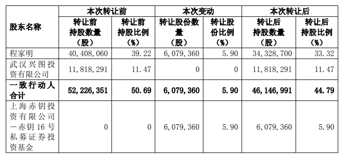 本次权益变动后,公司控股股东、实际控制人程家明直接持有公司股份34,328,700股,占公司总股本的33.32%,其一致行动人兴图投资持有公司股份11,818,291股,占公司总股本的11.47%,合计持有公司股份46,146,991股,占公司总股本的44.79%。受让方持有公司股份6,079,360股,占公司总股本的5.90%。