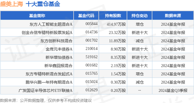 持有盛美上海最多的基金为东方人工智能主题混合A,目前规模为6.43亿元,最新净值1.1461(2月26日),较上一交易日下跌0.1%,近一年上涨35.89%。该基金现任基金经理为严凯。