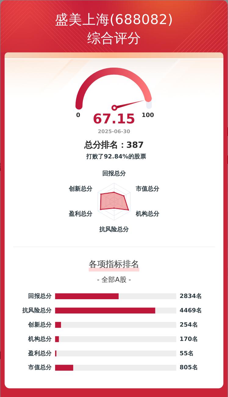 金融界上市公司研究院构建了一套上市公司韧性评价体系,从企业盈利、科技创新、股东回报、经营抗风险、市值表现及机构吸引力六个维度对企业进行量化评分,满分为100分。盛美上海的韧性评价总分为67.15分,在A股5405家可比上市公司中排名第387位。
