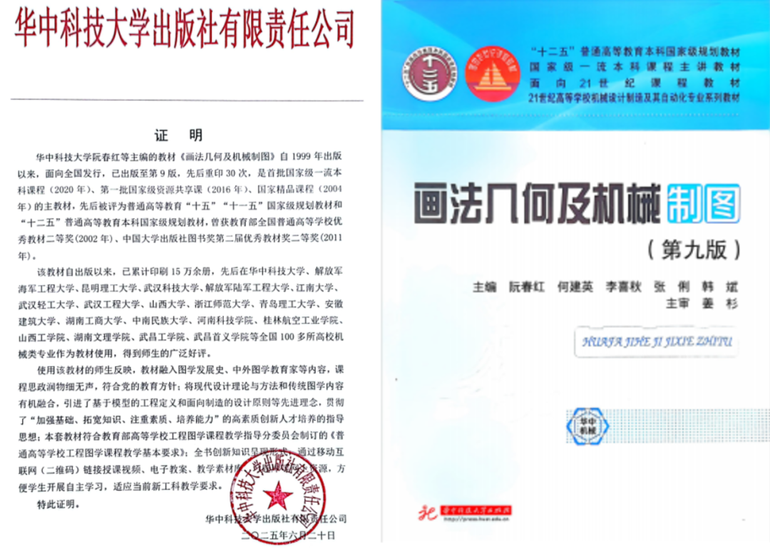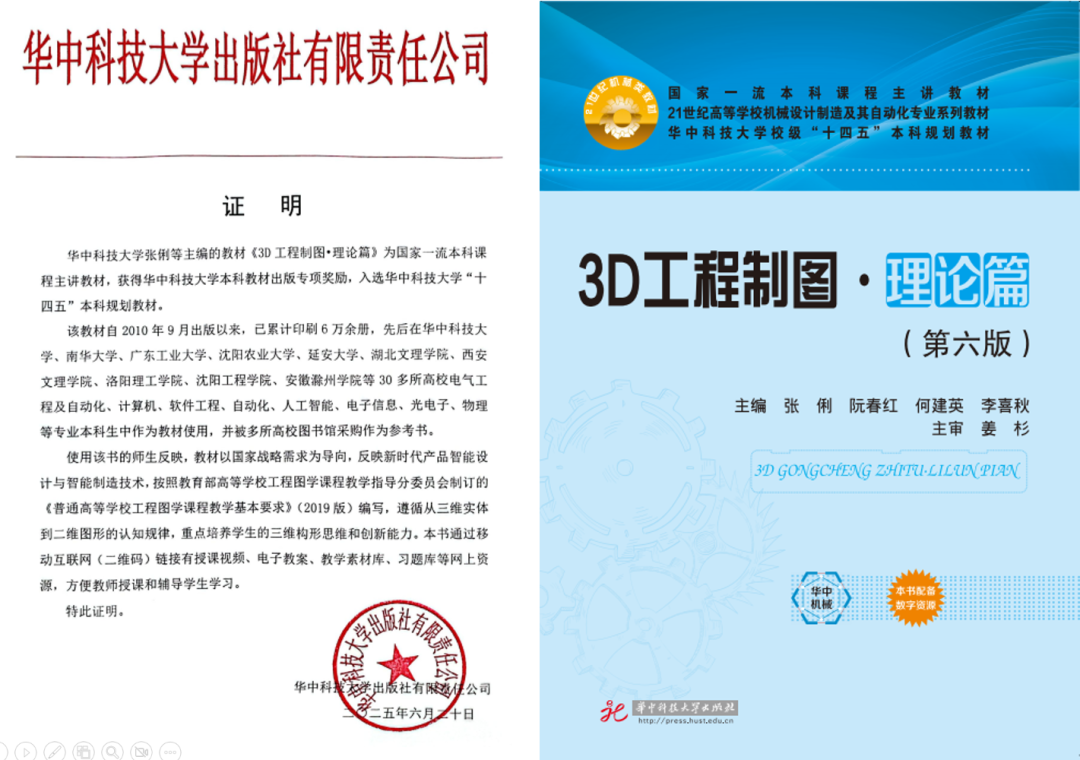 罗年猛介绍,图学教育研究与发展中心主编的《画法几何及机械制图》(由阮春红、张俐、何建英、李喜秋联合编写)、《3D工程制图》(由张俐、阮春红、何建英、李喜秋、韩斌联合编写)两套教材,已成为全国首批深度融合中望3D软件的高校教材,进入首批国家级一流本科课程,在 华中科技大学 、解放军 海军工程大学 、 昆明理工大学 、 武汉科技大学 、解放军陆军工程大学、 江南大学 、 武汉轻工大学 、 武汉工程大学 、 山西大学 、 浙江师范大学 、 青岛理工大学 、 安徽建筑大学 、 湖南工商大学 、 中南民族大学 、 河南科技学院 、桂林航空工业学院、 山西工学院 、湖南文理学院、 武昌工学院 、 武昌首义学院 等全国100多所高校推广使用,得到师生的广泛好评,年使用人次超6000。